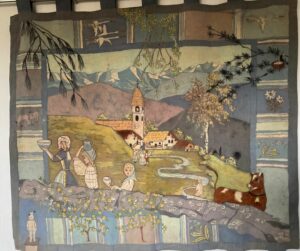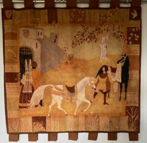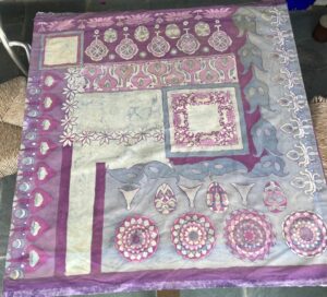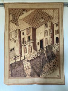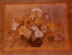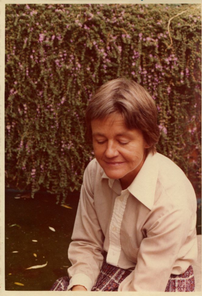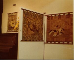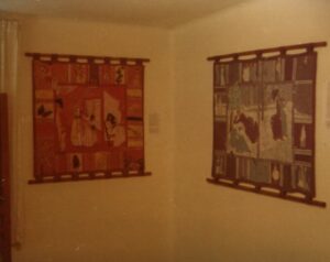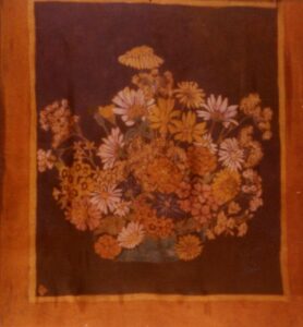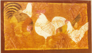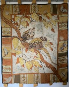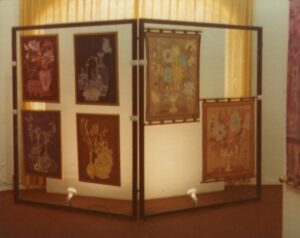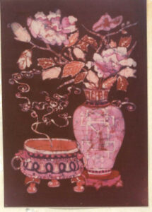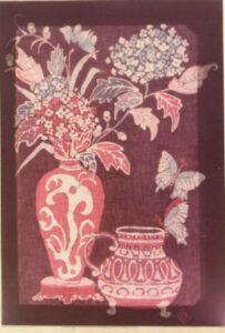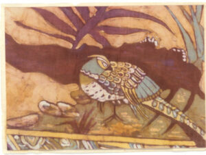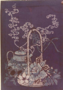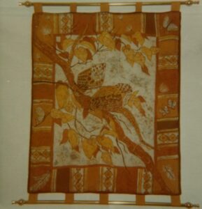 Betty was a highly creative person. She worked with a variety of media through her life. She enjoyed drawing and painting watercolours. She made embroideries. She designed and dyed curtains. Her great love, however, was the medium of batik. Between May 1974 and May 1988 she produced at least 139 batiks which were major works, suitable for wall-hangings. She experimented constantly, with a variety of techniques, cloth, waxes, colours and themes. She kept detailed notes of her procedures for each of the batiks.
